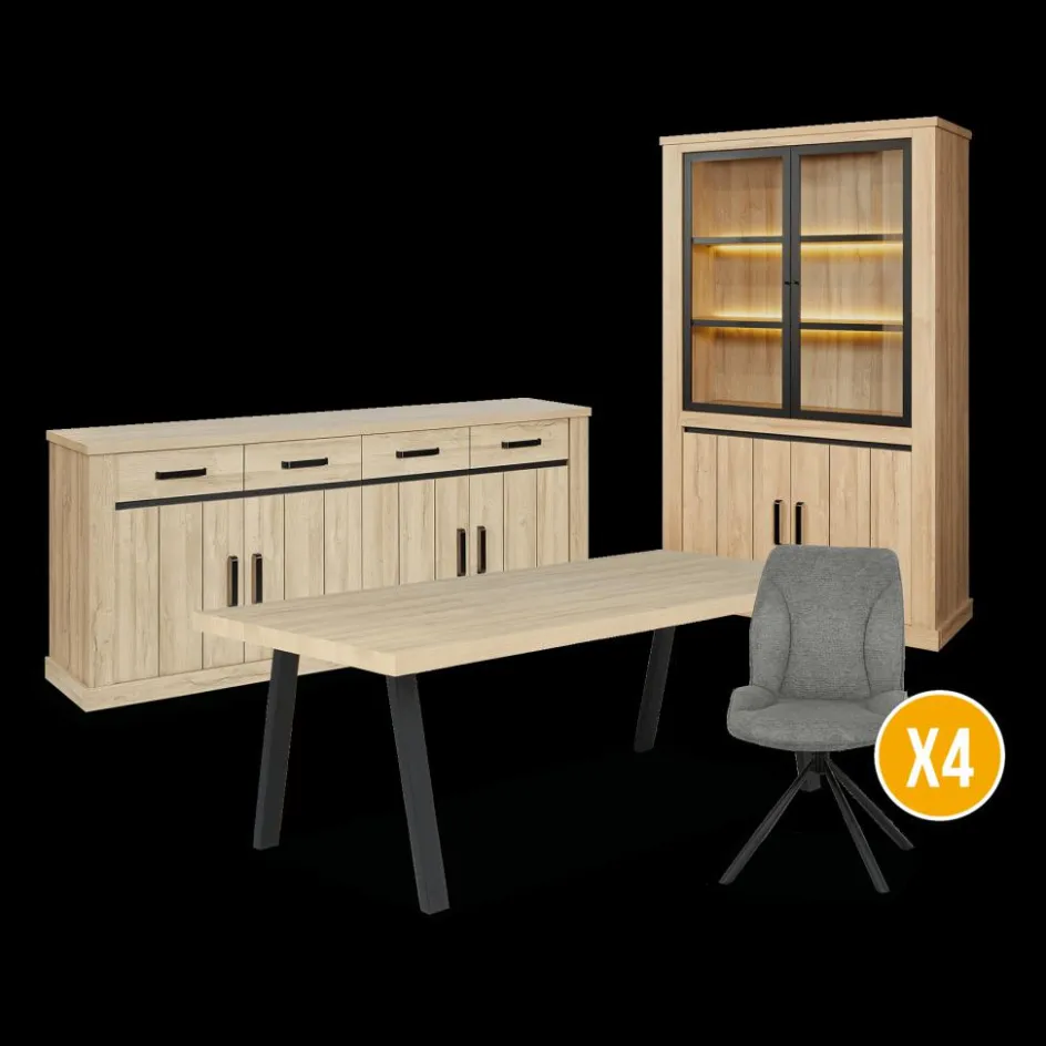 Woon- En Eetkamers|Ygo Eetkamer TEODOR: Dressoir + Vitrinekast + Eettafel ABBEY 200×100 + 4x stoelen INDIGO Mouse Grey