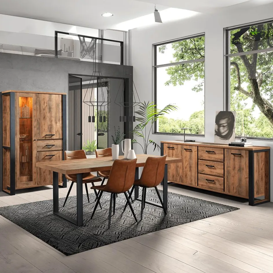 Woon- En Eetkamers|Ygo Eetkamer MADAGASCAR: Dressoir + Glaskast + Tafel 200×100 + 4 stoelen LORRY Cognac